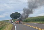 Carro pega fogo após colisão na PR-466 em Pitanga e duas pessoas ficam feridas