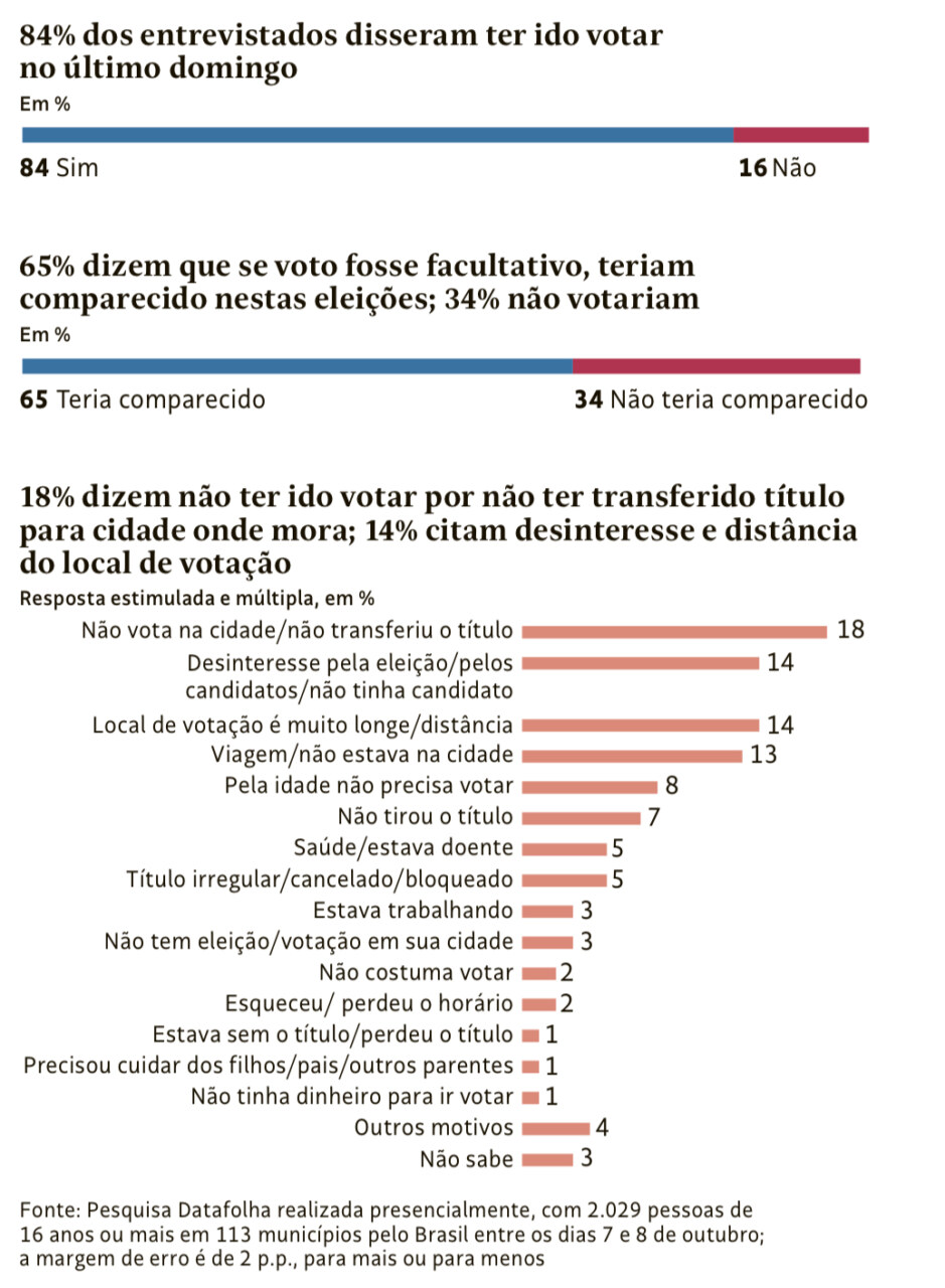 Entre os eleitores que não foram votar no domingo, 18% dizem não ter ido às urnas por estarem em uma cidade diferente de onde votam, 14% afirmam não estar estar interessados na eleição, 14% estavam longe dos locais de votação e 13% estavam viajando.