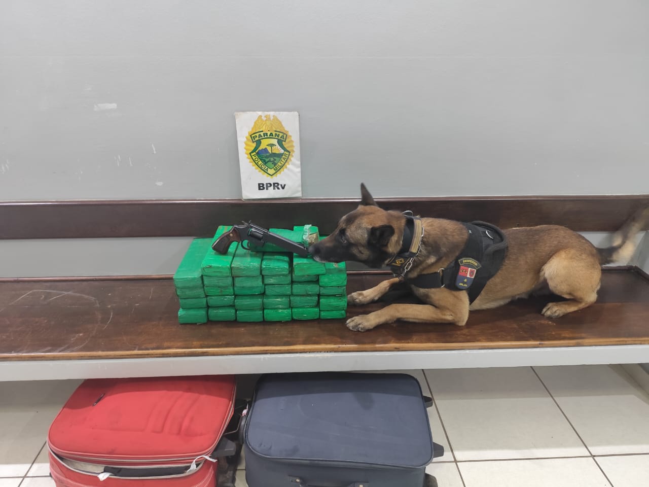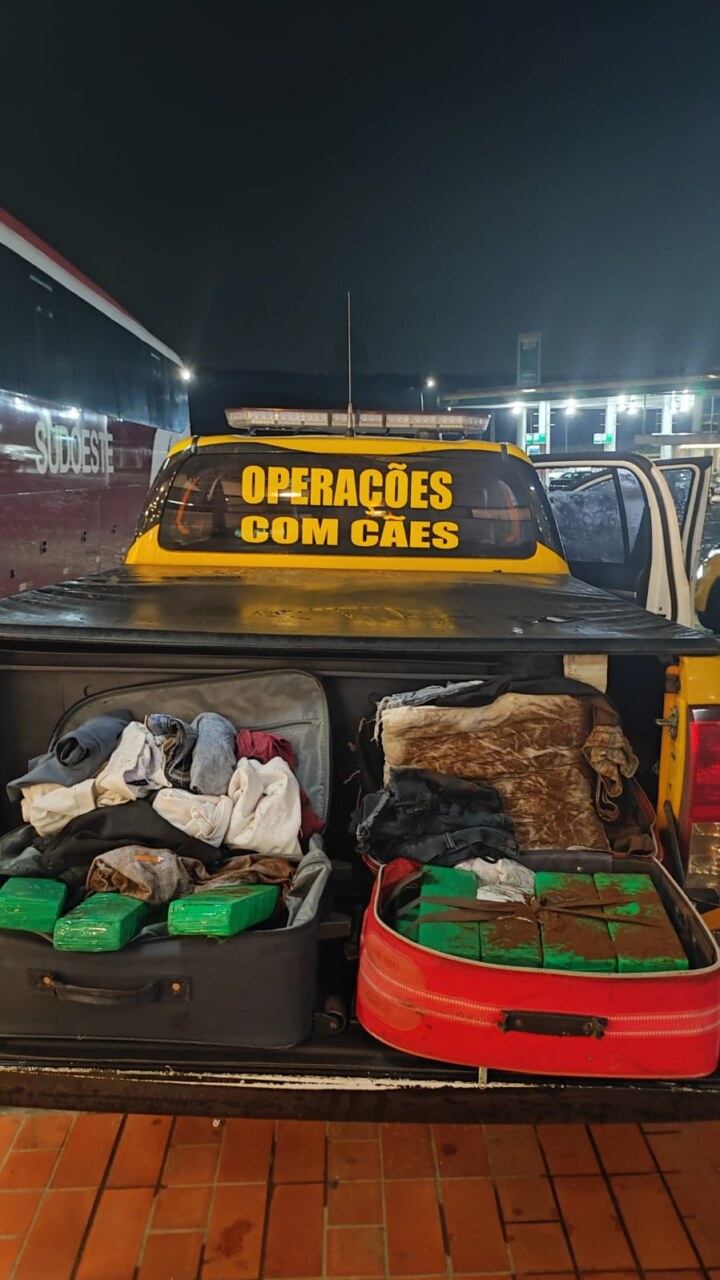 O cão Maximus deu apoio aos policiais para localizar a droga que estava escondida em uma mochila, em maio a roupas. Os tabletes da droga tinham pó de café, que é usado pelos traficantes para disfarçar o forte odor de droga.