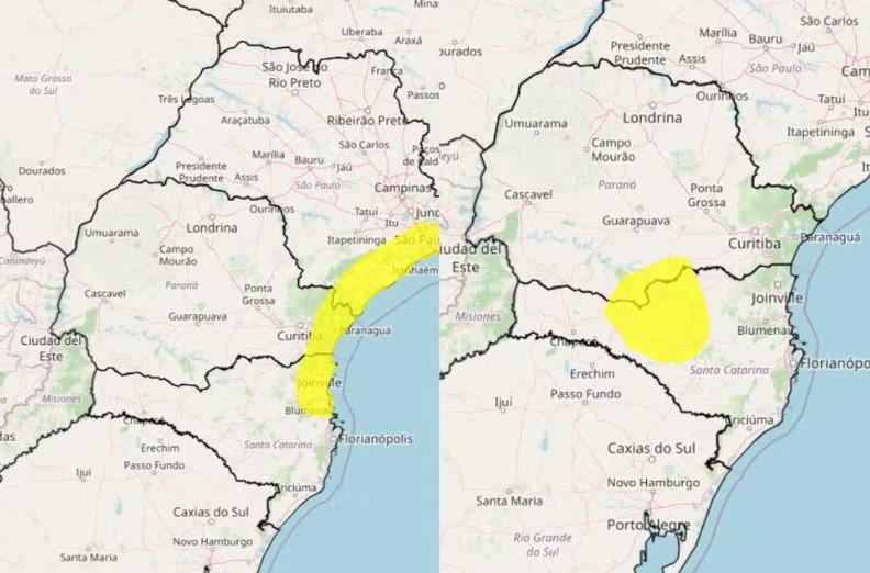 O primeiro alerta é para 12 cidades do sudeste e centro-sul paranaense. Ele começou ao meio-dia e deve se estender até às 23h59 desta quarta.