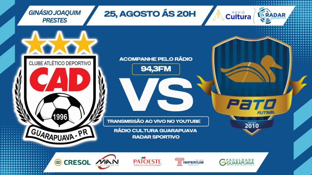 O Clube Atlético Deportivo (Cad) entra em quadra na noite desta segunda-feira (25/08) para enfrentar o Pato Futsal pela 14ª Rodada do Campeonato Paranaense de Futsal Série Ouro. A Rádio Cultura transmite a partida a partir das 19h30.
