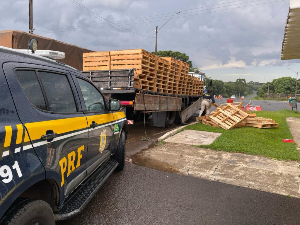 Os policiais deram ordem de parada para o condutor do caminhão M.Benz de cor branca e emplacamento de Cascavel (PR), e durante entrevista, o motorista informou que carregou a carga (paletes de madeira), em Guarapuava e estaria levando até o estado de São Paulo, porém não sabia o destino final da carga.