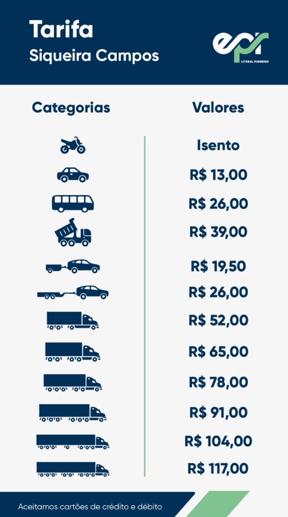 A cobranças nas praças de pedágio de Siqueira Campos e Sengés começa às 00h do dia 14 de março. A informação foi divulgada nesta manhã de quarta, 12, pela EPR Litoral Pioneiro, concessionária que administra o trecho. Até lá, os motoristas que passarem pelo local continuam recebendo informações sobre o futuro funcionamento durante a operação assistida, que se iniciou no dia 1 de março.