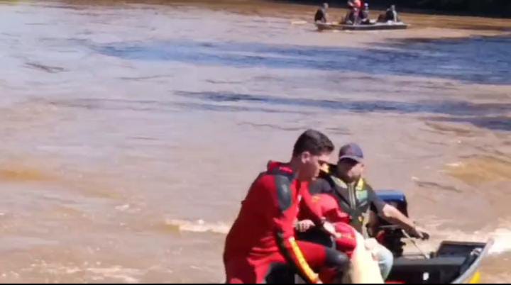 Na primeira noite, as equipes do Corpo de Bombeiros realizaram varreduras nas margens, sem resultados. No dia seguinte, foram empregadas embarcação, croques para varredura em profundidade, sonar e busca terrestre, não sendo possível o mergulho em virtude da forte correnteza e da incerteza quanto ao ponto exato do acidente.
