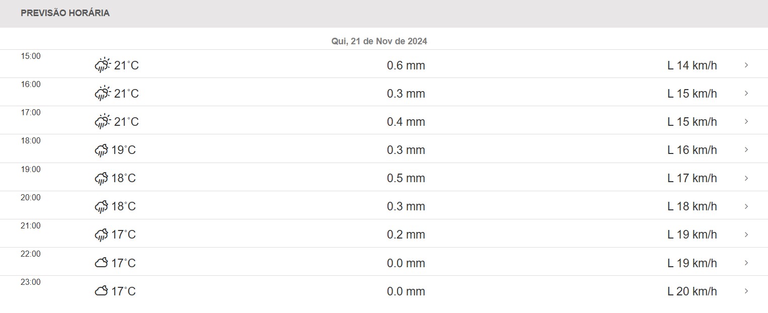 A previsão é de um volume de chuva entre 20 e 30 mm por hora ou 50 mm por dia, com ventos intensos de 40 a 60 km/h.