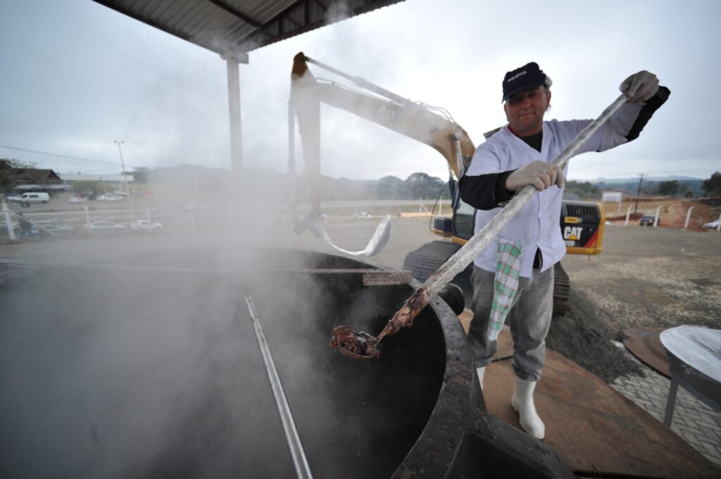 Neste ano, a tradicional feijoada gigante de Prudentópolis será composta por 1,3 mil quilos de embutidos e defumados, 500 quilos de feijão, mil litros de água, além do tempero e sete metros de lenha para abastecer o fogo durante aproximadamente oito horas de preparo.