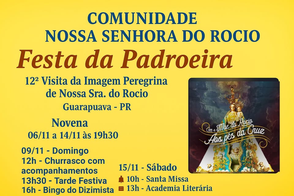 A Comunidade Nossa Senhora do Rocio, que faz parte da paróquia São Pedro e São Paulo começa nesta quinta-feira, dia 6 de novembro de 2025, a novena em honra a padroeira, às 19h30. As festividades seguem até o dia 14 de novembro, com barraquinhas todas as noites. Hoje, às 18h30 sairá a caminhada com o Manto de Nossa Senhora, da matriz São Pedro e São Paulo até a comunidade.