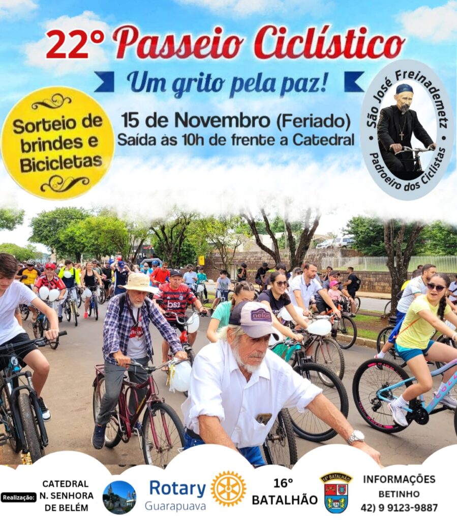 O tradicional Passeio Ciclístico “Um grito pela paz” está marcado para o dia 15 de novembro, que neste ano chega à sua 22ª edição. O evento, que já faz parte do calendário local, é uma iniciativa que une esporte, fé e convivência fraterna, reunindo famílias inteiras em um grande movimento pela paz.