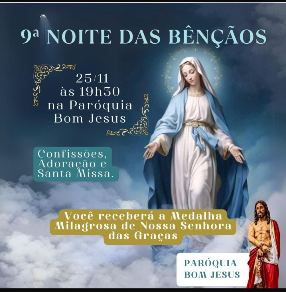 A paróquia Bom Jesus realiza nesta segunda-feira, 25 de novembro de 2024, a 9ª Noite das Bençãos com Nossa Senhora das Graças. Haverá bênção do Santíssimo, confissões e Santa Missa com a entrega da Medalha Milagrosa de Nossa Senhora das Graças.