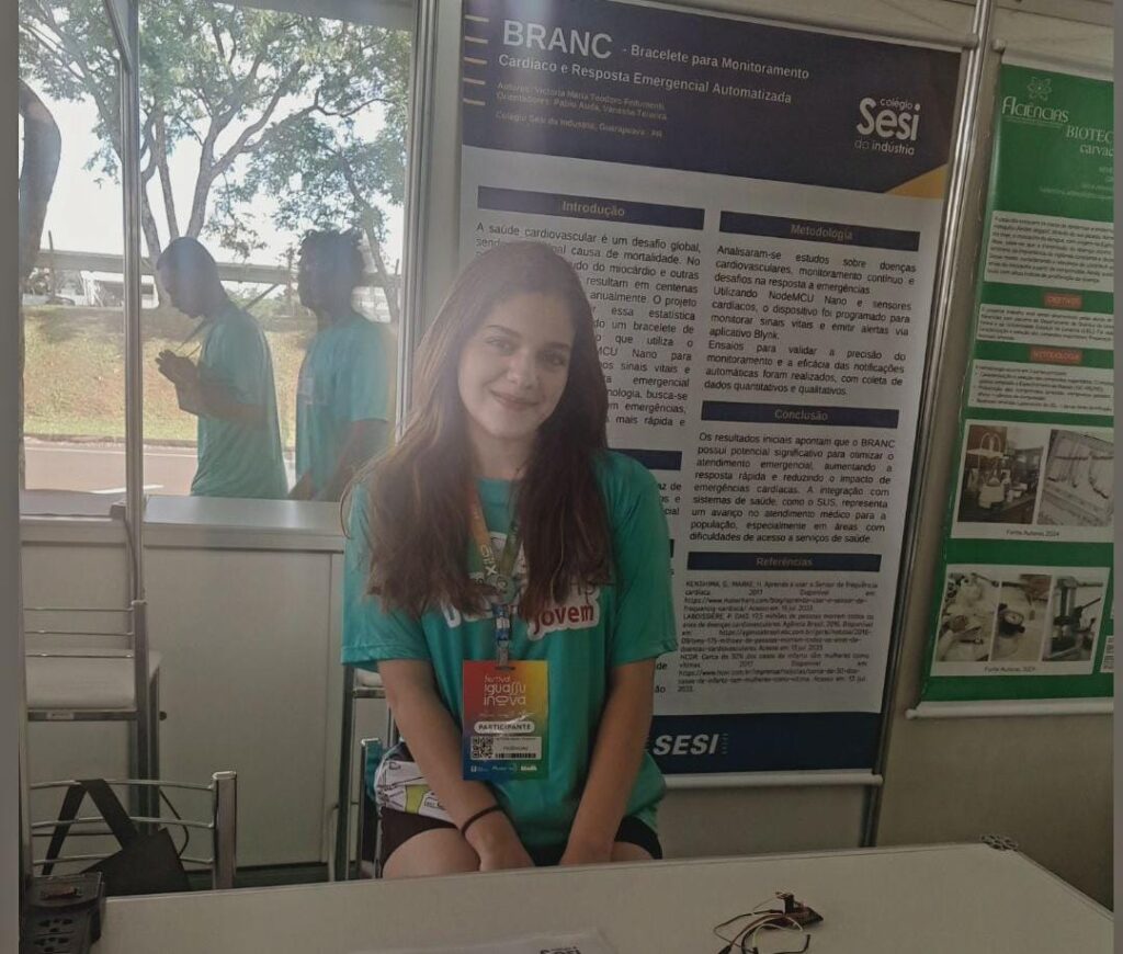 A estudante Victoria Maria Fedumenti, do Colégio Sesi Guarapuava, apresentou o projeto BRANC – Bracelete para Monitoramento Cardíaco, um inovador bracelete de monitoramento cardíaco, na 13ª edição da Feira de Inovação das Ciências e Engenharias (FIciências), realizada no Itaipu Parquetec, em Foz do Iguaçu, na última semana de novembro.