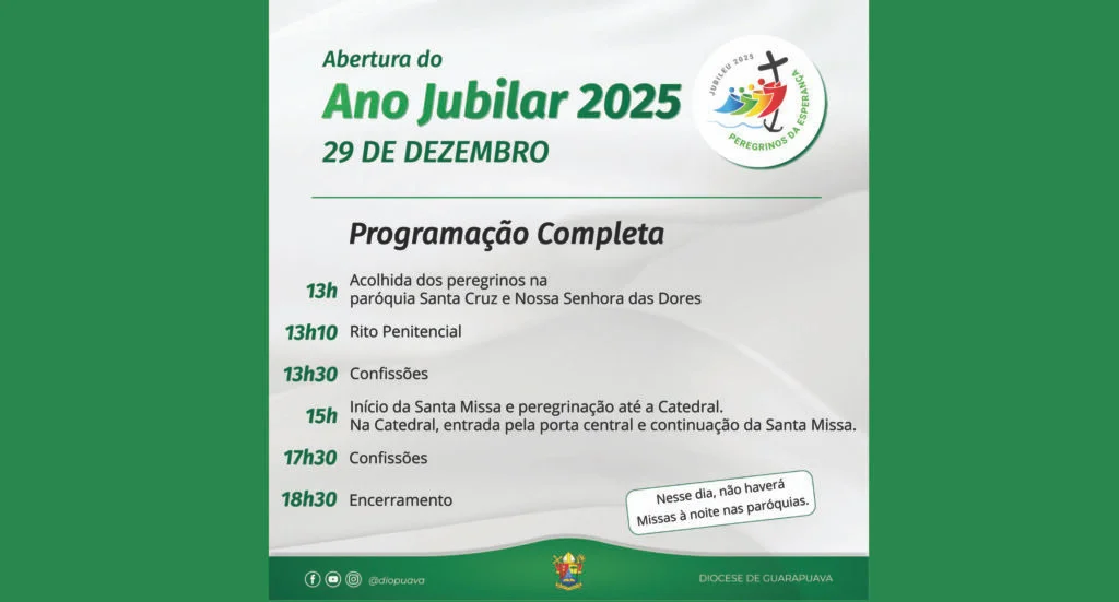 No próximo domingo, dia 29 de dezembro de 2025, a diocese de Guarapuava vai realizar a abertura solene do Ano Jubilar 2025. Representantes de todas as 48 paróquias da diocese, estarão concentrados a partir das 13h na paróquia Santa Cruz Nossa Senhora das Dores, no bairro Santa Cruz, onde às 15h terá início a Santa Missa. Em seguida os fiéis sairão em peregrinação até a Catedral Nossa Senhora de Belém. A partir das 13h10, na paróquia Santa Cruz Nossa Senhora das Dores, acontecerá o Rito Penitencial e às 13h30 as confissões.