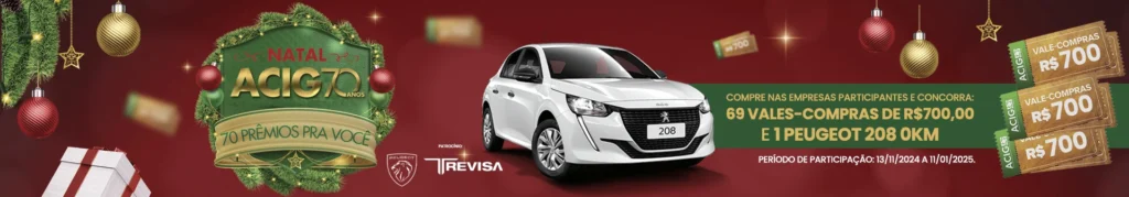 Nesta sexta-feira (17) o sorteio acontecerá na sede da ACIG, às 10 horas. A campanha “Natal ACIG 70 anos, 70 prêmios pra você” vai contemplar 70 consumidores com 69 vales-compras e um carro zero-quilômetros.