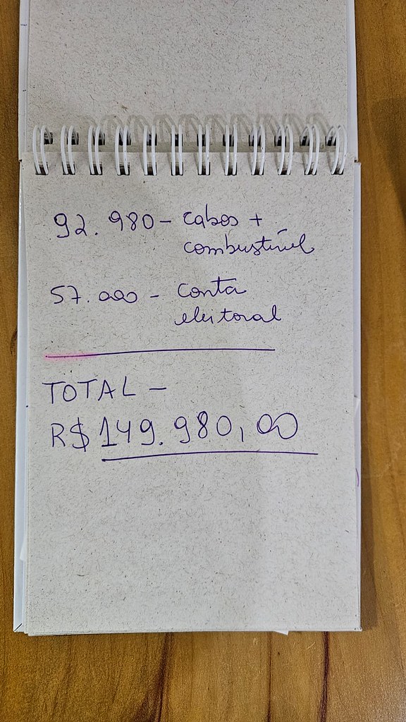 Na ‘contabilidade improvisada’, consta uma despesa de “cabos”, possível referência a cabos eleitorais, e combustível. Logo abaixo, um ítem conta eleitoral. Somados, os dois valores chegam a R$149.980,00.