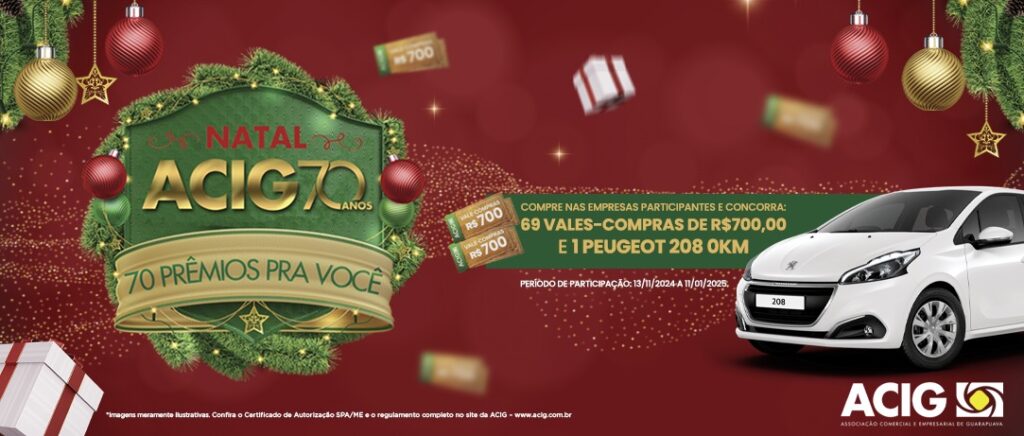 A Associação Comercial e Empresarial de Guarapuava (ACIG) lançou a campanha “Natal ACIG 70 anos, 70 prêmios pra você”. Serão sorteados 69 vale-compras e um carro 0 km modelo Peugeot 208. A campanha vai incentivar os consumidores a valorizarem as lojas participantes, promovendo um fluxo de compras que beneficie os negócios locais.