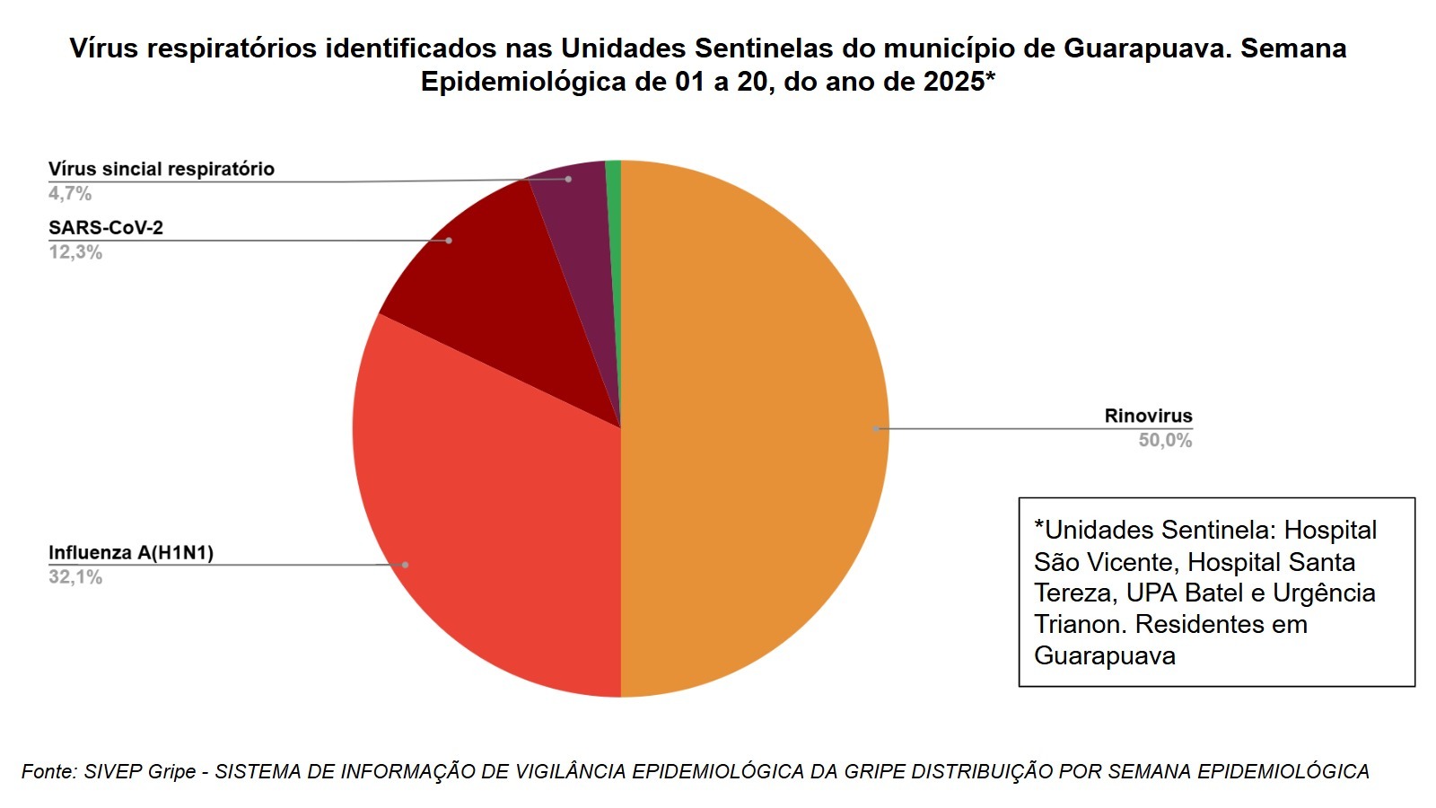 Nas amostras analisadas em Guarapuava, o Rinovírus foi o vírus mais comum — ele costuma causar resfriados. Depois aparecem o Influenza A (H1N1), com 32,1%, e o Coronavírus (COVID-19), com 12,3%. Também houve casos de Vírus Sincicial Respiratório (VSR). A cidade registrou cinco mortes por COVID-19 entre os casos mais graves até o momento.