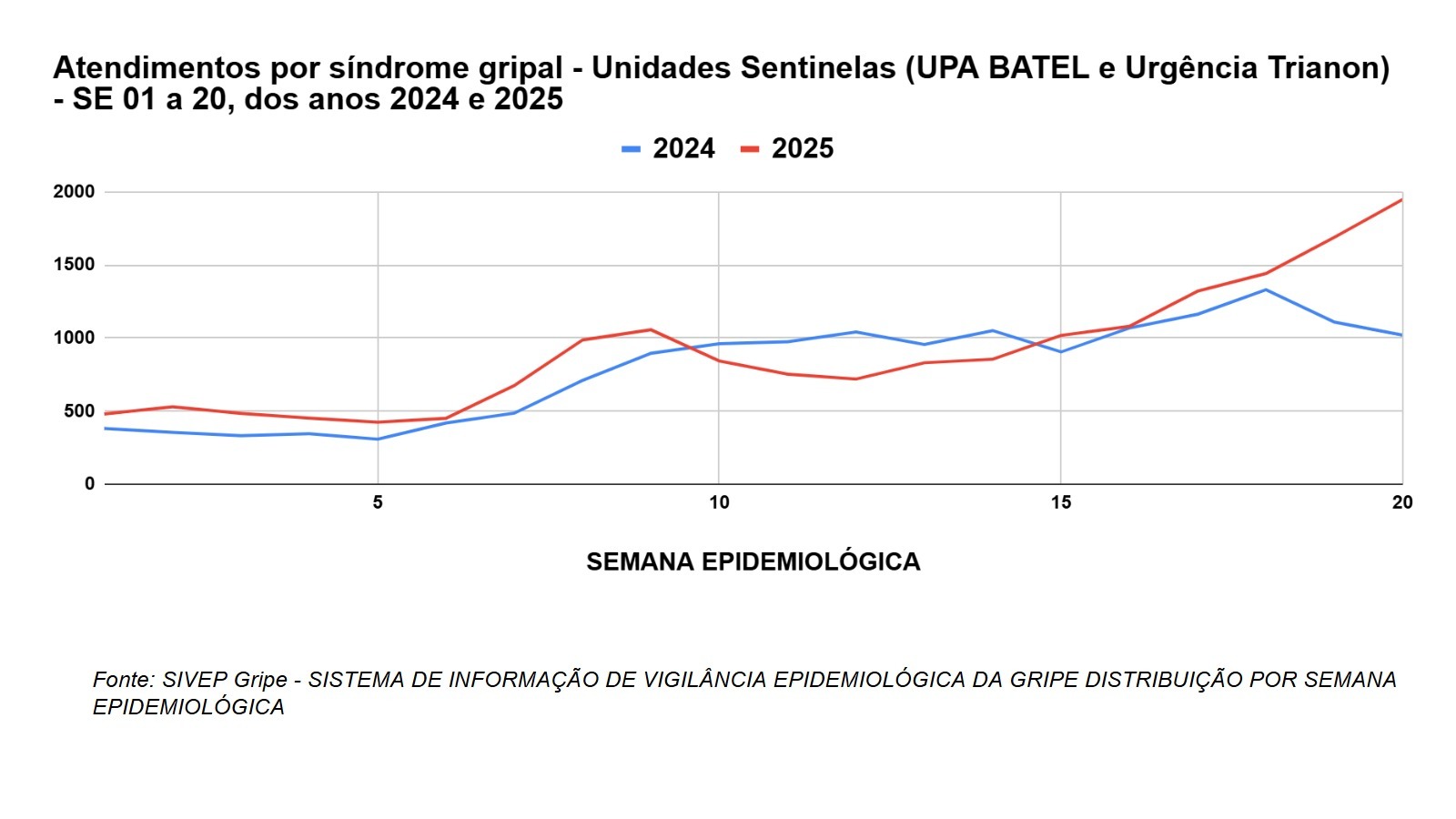 Um gráfico divulgado pela Secretaria mostra que, nas 20 primeiras semanas epidemiológicas do ano, o número de atendimentos foi maior em 2025 do que em 2024. A diferença ficou mais evidente entre as semanas 15 e 20, quando os casos subiram com mais força. O maior pico foi registrado na semana 20, que abrange o período de 11 a 17 de maio. Nessa semana, foram quase 2 mil atendimentos. No mesmo ponto do gráfico do ano passado, esse número ficou perto de 1.300.