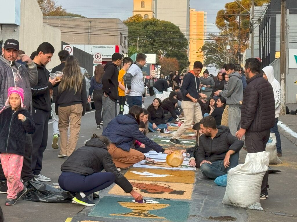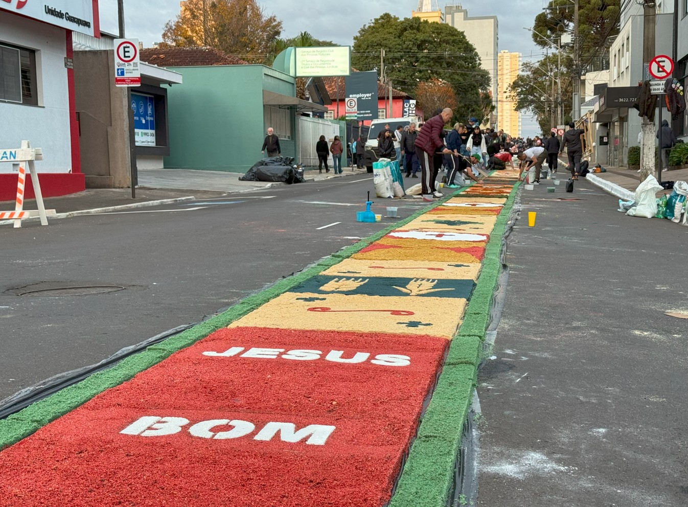 Ruas da região central de Guarapuava amanheceram, nesta quinta-feira (19), transformadas em uma verdadeira galeria a céu aberto. Foram 1.126 metros de tapetes confeccionados para a celebração de Corpus Christi, com a participação direta de 14 paróquias da cidade. A confecção dos tapetes começou ainda na madrugada, mobilizando centenas de fiéis em um trabalho coletivo de fé, arte e dedicação.