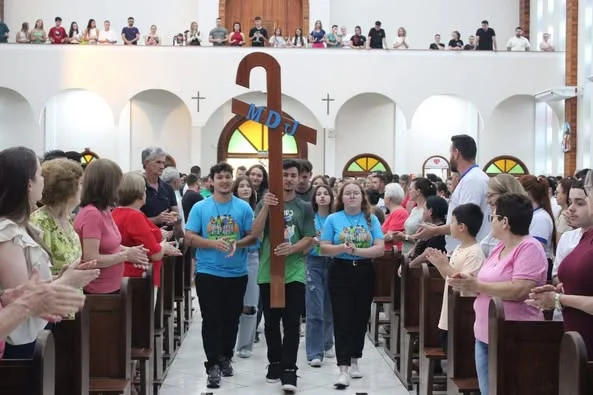 A 21ª edição da MDJ ocorrerá na paróquia no ano de 2026, e no último domingo (12), na Santa Missa das 19h, na Paróquia Sant’ana, em Laranjeiras do Sul, aconteceu a acolhida da Cruz Missionária da Missão Diocesana Juvenil (MDJ).