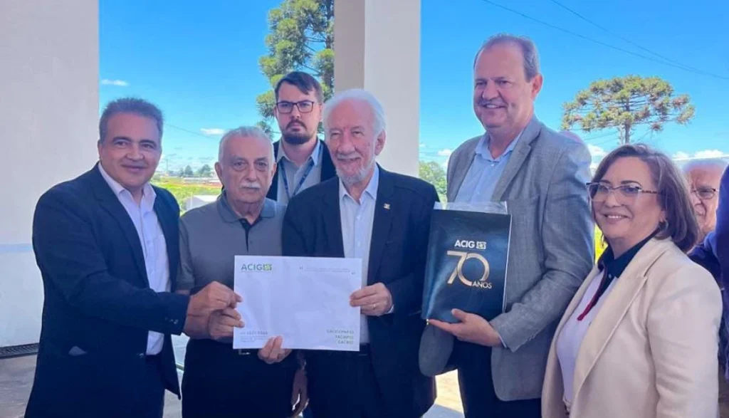 A entrega ocorreu na ma manhã desta quarta-feira (11/12), durante a inauguração do Laticínio Fortim. O presidente da ACIG, Claudinei Pereira, e a Diretora de Eventos e presidente eleita (gestão 2025/2026), Maria Inês Guiné, entregaram em mãos ao vice-governador do Paraná. Também receberam o documetno o Secretário de Ciência Tecnologia e Ensino Superior, Aldo Bona.