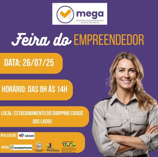 A Feira do empreendedor do projeto Mega acontece nesse sábado, 26 de julho, das 9h às 14h no estacionamento o shopping Cidade dos Lagos, em Guarapuava.