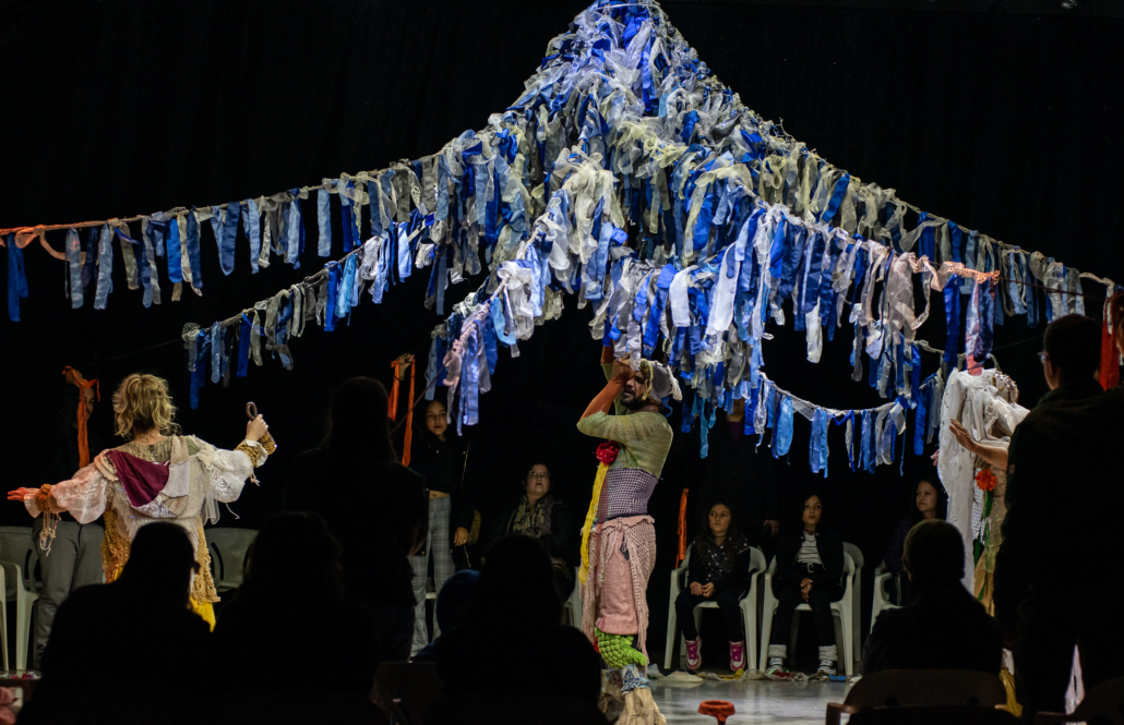 Nesse lugar simbólico, amontoado às ruínas de tudo aquilo que foi ou vai ser um dia, vive Terreno. Ali, os três passam a compartilhar a mesma terra e testemunham a anunciação de uma tempestade devastadora. Para sustentar o céu e conseguir tecer o amanhã, os viajantes são convocados a deixar pelo caminho tudo aquilo que precisa morrer. O espetáculo adulto propõe uma reflexão sobre os processos de transformação necessários para o crescimento pessoal e coletivo.