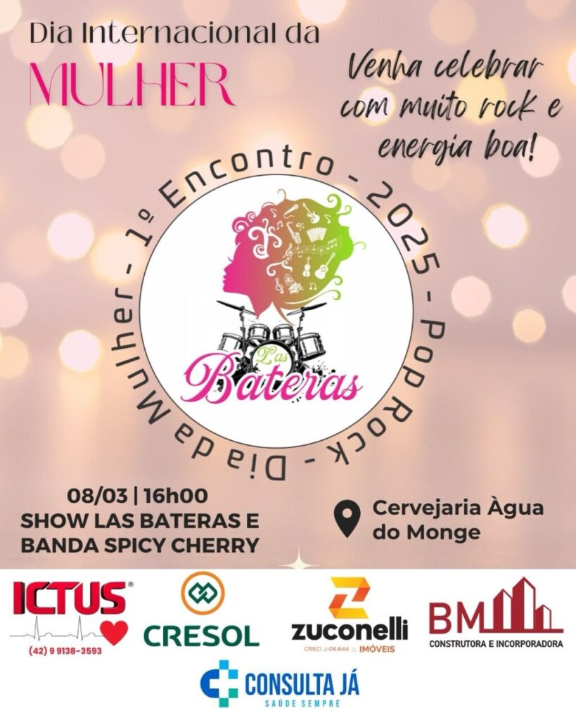 No dia 8 de março, a cidade de Guarapuava será palco do 1º Encontro LAS BATERAS, um evento cultural que celebra a força e a resiliência das mulheres por meio da música e da arte. A programação acontece na Cervejaria Água do Monge, a partir das 16h, e contará com diversas atrações.