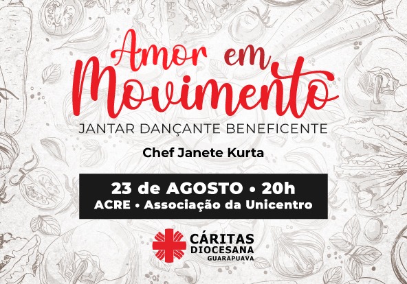 A Cáritas Diocesana de Guarapuava realiza no próximo sábado, dia 23 de agosto de 2025, o jantar dançante beneficente “Amor em Movimento”, às 20h, na ACRE – Associação da Unicentro.