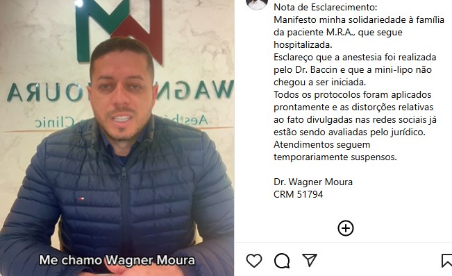 Wagner Moura, médico responsável pelo procedimento estético que seria realizado em Mariluci Ribeiro Andretti, paciente que teve uma complicação, falou sobre o assunto em um vídeo publicado nas redes sociais.