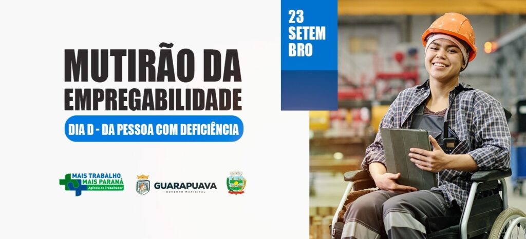 A Prefeitura de Guarapuava realiza, na próxima terça-feira (23/09), por meio da Agência do Trabalhador, o Mutirão de Empregos para Pessoas com Deficiência, atividade que integra o Dia D, iniciativa estadual voltada à inclusão no mercado de trabalho. O evento acontece de forma simultânea em diversos municípios do Paraná e tem como objetivo oferecer um maior número de vagas para pessoas com deficiência, ampliando oportunidades e fortalecendo a diversidade nas empresas.