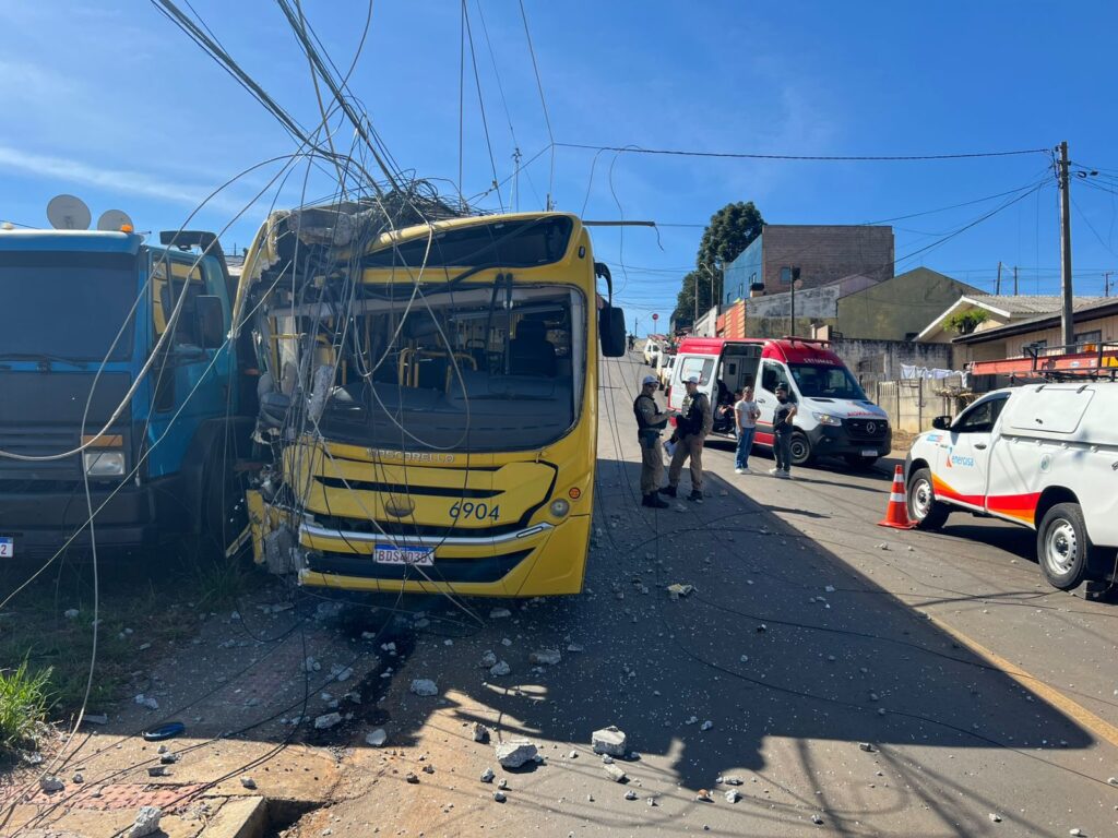 Um ônibus da empresa Pérola do Oeste colidiu com um poste e um caminhão na tarde desta quinta-feira (18/09), na rua Luiz Cunico, na Vila Bela. Passageiros ficaram feridos e a energia na região foi interrompida.