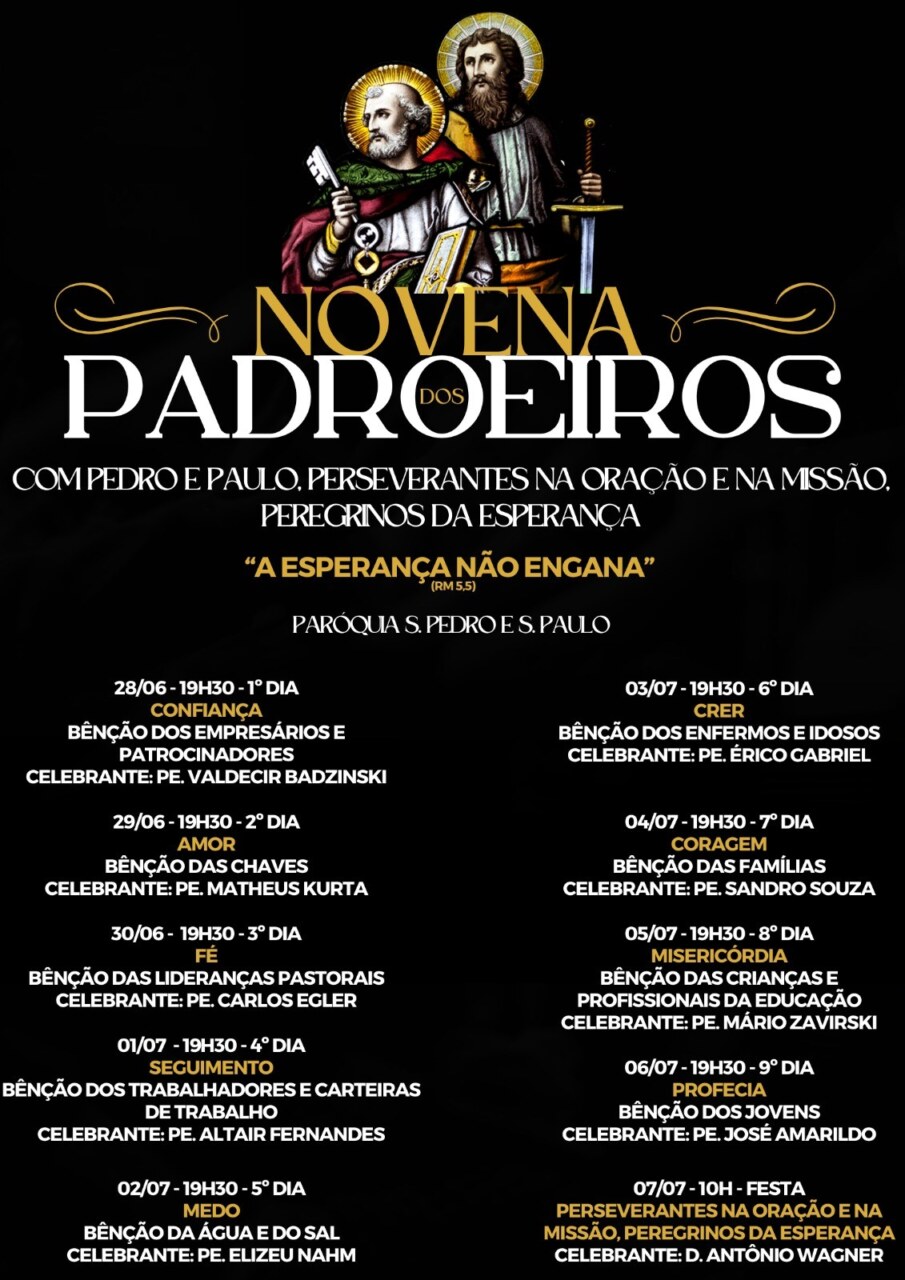 A Paróquia São Pedro e São Paulo, em Guarapuava, se prepara para celebrar os padroeiros. A programação religiosa começa na próxima sexta-feira (28), com a novena, que tem como tema central “Com Pedro e Paulo, perseverantes na Oração e na Missão, Peregrinos da Esperança”, em sintonia com o Ano da Oração, com as diretrizes diocesanas e já em preparação para o Jubileu de 2025.