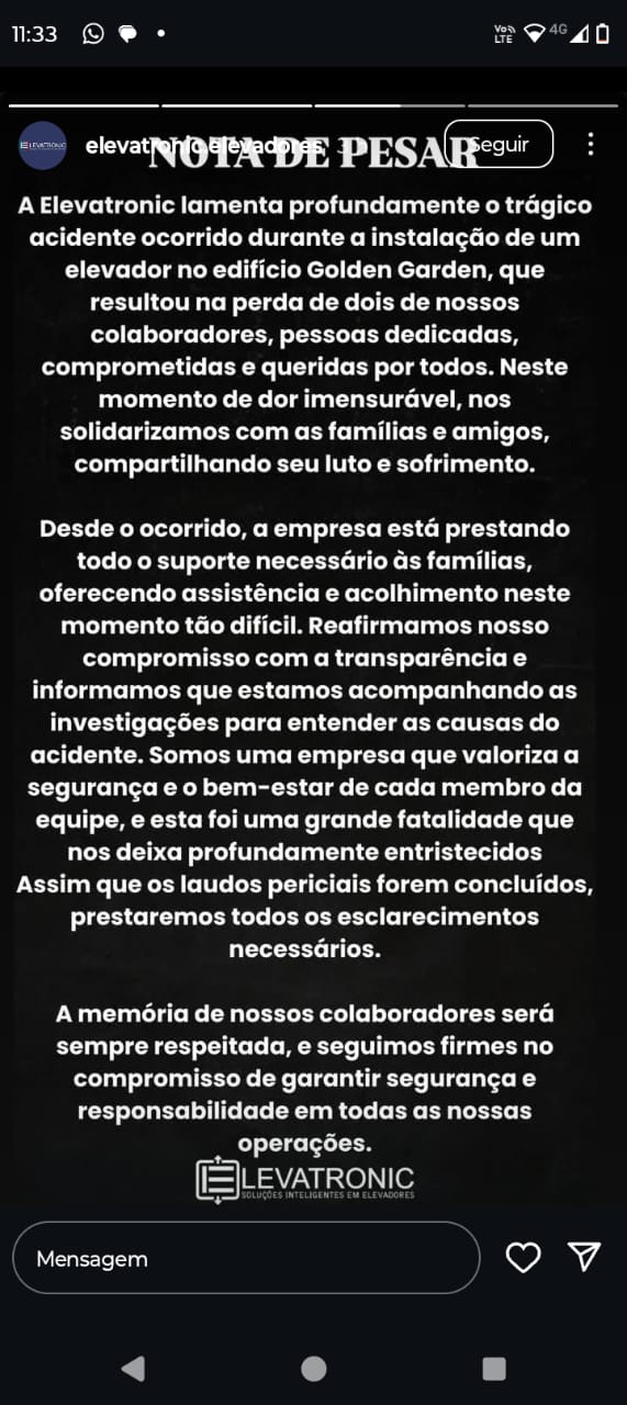 “A investigação pauta-se nos equipamentos de segurança”, afirmou em comunicado à imprensa. Caso constate que não havia ou que não eram usados os equipamentos, os responsáveis podem responder por homicídio culposo.
