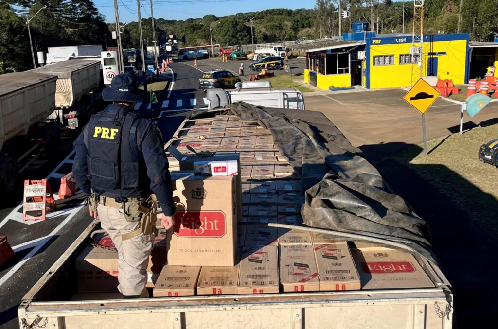 A Polícia Rodoviária Federal (PRF) apreendeu cerca de 833 mil maços de cigarros de origem estrangeira na tarde desta quinta-feira (31), em Guarapuava. A apreensão ocorreu por volta das 14h durante uma fiscalização na BR-277.