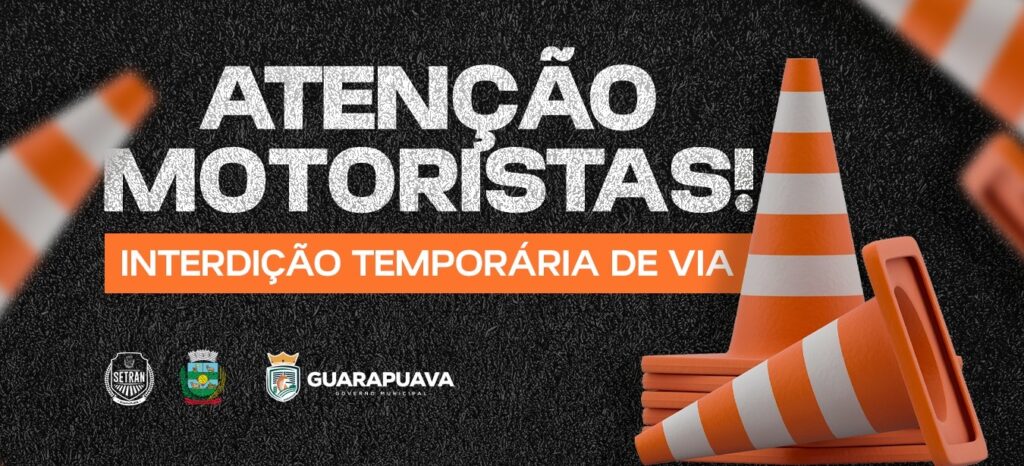 A Prefeitura de Guarapuava, por meio da Secretaria de Trânsito (SETRAN), informa que haverá interdição temporária da Rua Doutor Laranjeiras, entre as ruas Presidente Getúlio Vargas e Capitão Rocha, neste sábado (20), a partir das 7h, para a realização de corte de árvore, localizada no Colégio Estadual Carneiro Martins.