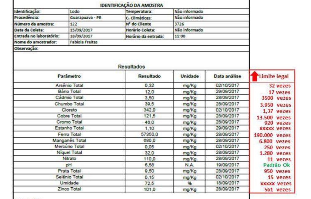 Um laudo pericial feito a pedido da Justiça por uma química independente apontou que o lodo tem índices elevados de contaminação.