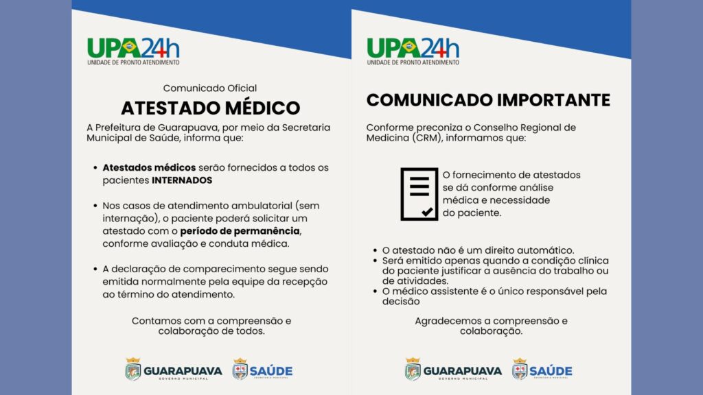 NOTA DE ESCLARECIMENTO – ATESTADOS MÉDICOS NAS UPAs DE GUARAPUAVA