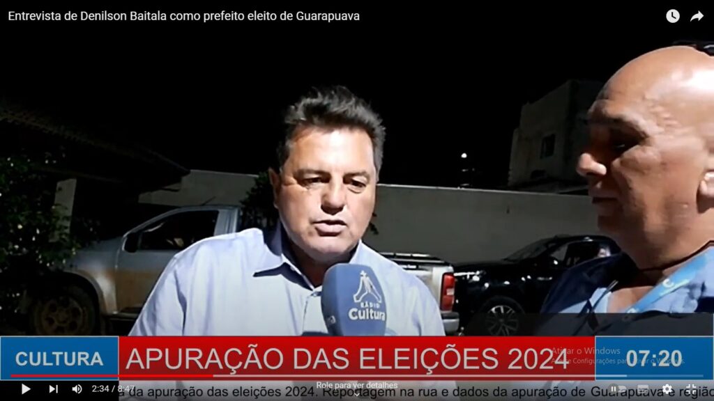 O prefeito eleito de Guarapuava, Denilson Baitala (PL), concedeu a primeira entrevista ao repórter Tonico de Oliveira. Ele fez agradecimentos aos apoiadores e disse que pretende fazer uma gestão técnica.