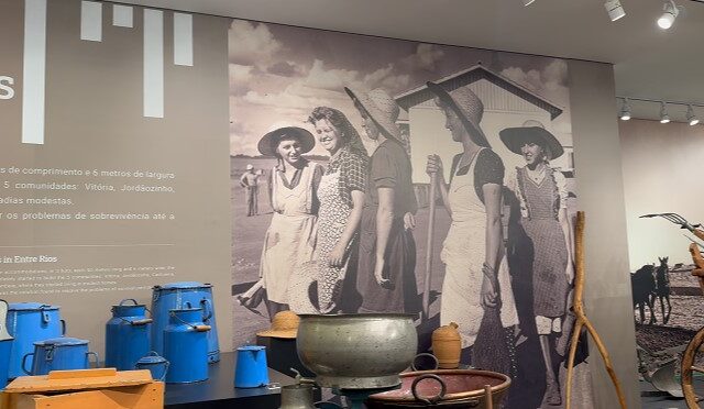 Painel com a foto de trabalhadoras suábias. Foto: William Batista/ Rádio Cultura