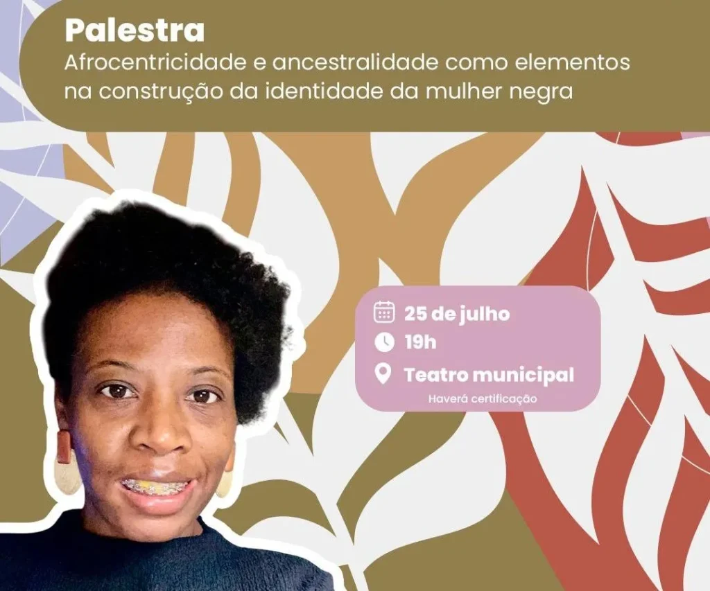 - 19h30 – Palestra “Afrocentricidade e ancestralidade como elementos na construção da identidade da mulher negra’’