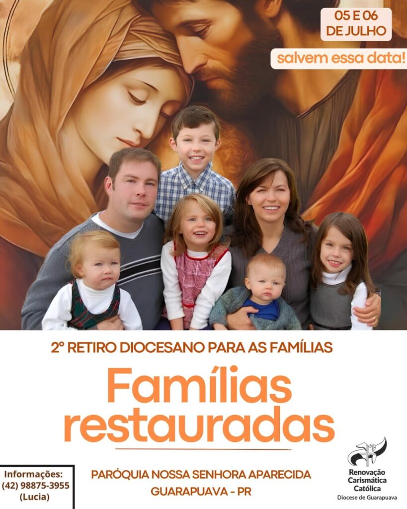 A paróquia e santuário Nossa Senhora Aparecida, Renovação Carismática Católica (RCC) e Grupo de Oração Caminhando com Jesus e Maria realizam nos dias 5 e 6 de julho de 2025, o 2º Retiro Diocesano para as Famílias. Será no salão paroquial da igreja, a partir das 14 horas do sábado.