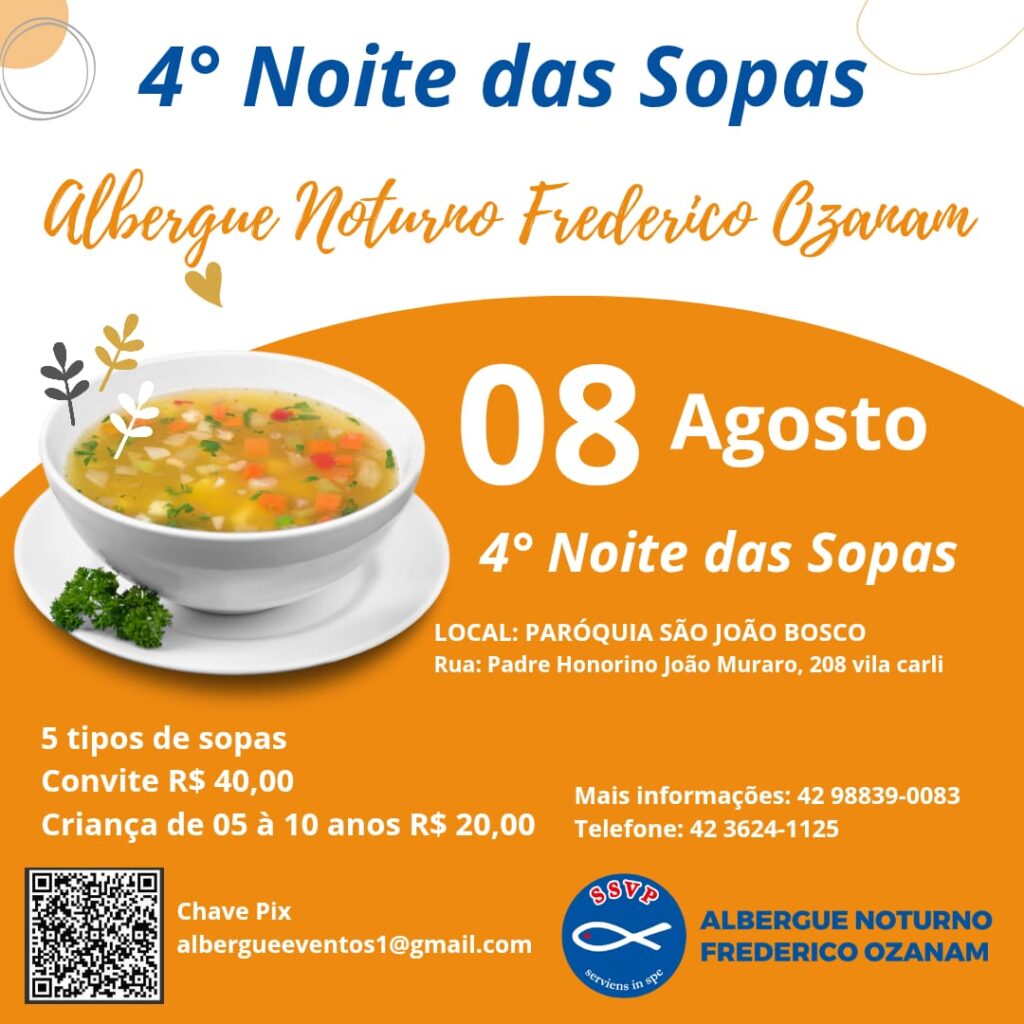 O Albergue Noturno Frederico Ozanan, em Guarapuava, promove nesta sexta-feira, 8 de agosto de 2025, a 4ª Noite das Sopas. O evento será a partir das 19 horas, no salão da paróquia São João Bosco, localizado na rua Pedro Honorino João Muraro, nº 208, na Vila Carli.
