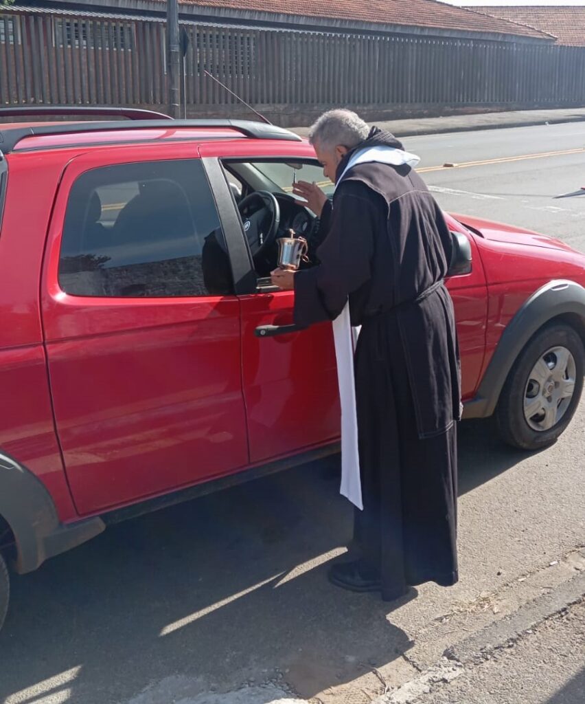 Os condutores de veículos, motos e caminhões que passarem pela avenida Depultado Cesar silvestri – em frente ao 16º Batalhão de Polícia Militar – serão recebidos pelo padre Frei Célio Ferreira, administrador paroquiano e pelo seminarista Eduardo, para uma bênção e orações.