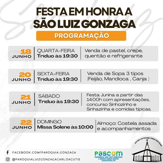 A Paróquia São Luiz Gonzaga e Beato Carlo Acutis, localizada no bairro Morro Alto, em Guarapuava, dará início nesta quarta-feira, 18 de junho de 2025 a festa em honra ao seu padroeiro, São Luiz Gonzaga. A comunidade poderá participar de celebrações e bênçãos especiais, atividades culturais e festa gatronômica até o domingo (22).