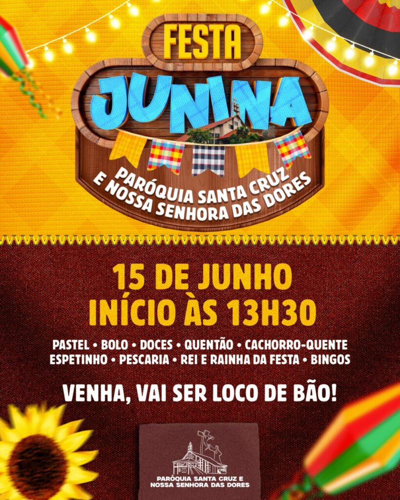A Paróquia Santa Cruz e Nossa Senhora das Dores realiza no próximo domingo, 15 de junho de 2025, a tradicional Festa Junina, a partir das 13h30. O evento será realizado no salão da paróquia e promete reunir a comunidade em uma tarde repleta de cultura, gastronomia e diversão.