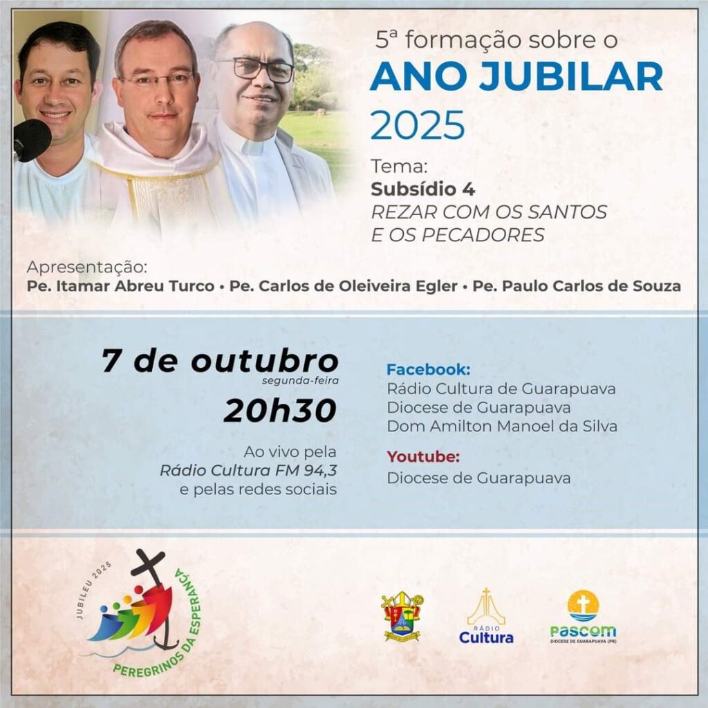 A primeira foi feita pelo bispo diocesano de Guarapuava, Dom Amilton Manoel da Silva, com o tema: Peregrinos da Esperança. O Subsídio 1, “Rezar Hoje” foi com o Frei Walter dos Santos, FMM, no dia 26 de agosto de 2024. Em 9 de setembro, aconteceu a terceira apresentação: subsídio 2 – Rezar com os Salmos – Ir. Clotilde Rodrigues Bonfim, CS. Já o “subsídio 3 – A Oração de Jesus” com o Padre Jean Patrik Soares foi realizado em 23 de setembro. Nesta segunda-feira, 7 de outubro será a vez da quinta formação: subsídio 4 – Rezar com os Santos e os Pecadores, com os padres Itamar Turco, Paulo Souza e Carlos Egler
