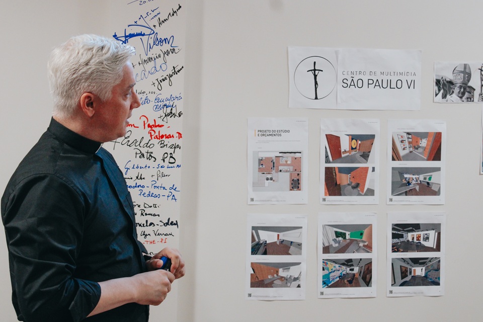 Antes da cerimônia, os bispos assinaram uma das colunas do espaço do novo estúdio. Padre Arnaldo relacionou a estrutura que sustenta as paredes com os bispos e sua missão na Igreja. Ali, as assinaturas ficarão preservadas como um memorial.